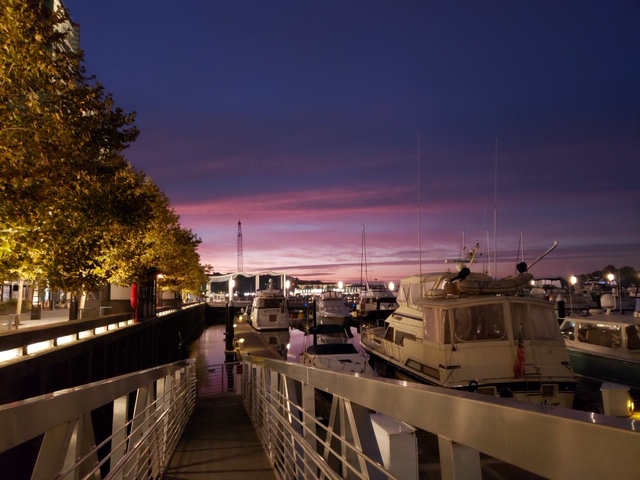 This is the sunrise just breaking over the waterfront as we leave the boat to go to the clubhouse early in the morning. We see this kind of view a lot, far more than we ever saw when we lived on land.