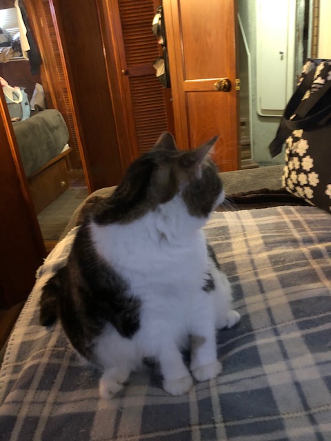 The shot below is of The Duchess, our older Grey Tabby, sitting on the bed in the Master Cabin. She is looking back toward the stairwell to the Galley area for her nemesis, Penny.