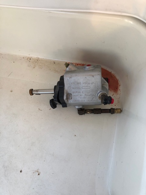 The picture below is the old helm control, a 250 V model which had been replaced by the 1250 V with better technology, simplified system construct and easier bleed out for trapped air. This old unit will either be shipped to the distributor/rebuild company, if they want it and are willing to cough a couple of dollars, or we will toss it out.