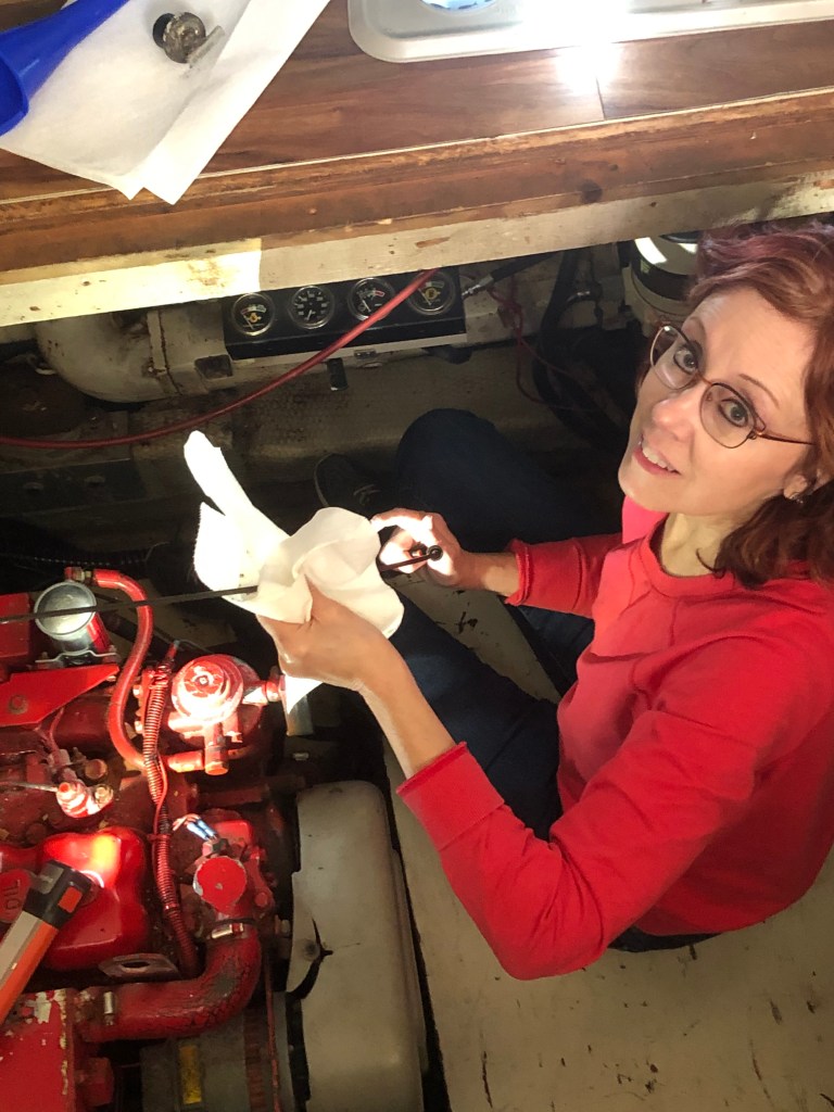 The photo below is of Charlotte in the engine room bilge area, checking the fluid levels in the main engines, the transmissions and the generator, prior to start up to ensure that the proper levels of oil are available. Damage to one of these engines is NOT something we ever want to experience again. She had to add some oil to the port engine, but the starboard was okay. We will be changing the fluids out come spring, according to our plan. Depends on the availability of the diesel specialist.