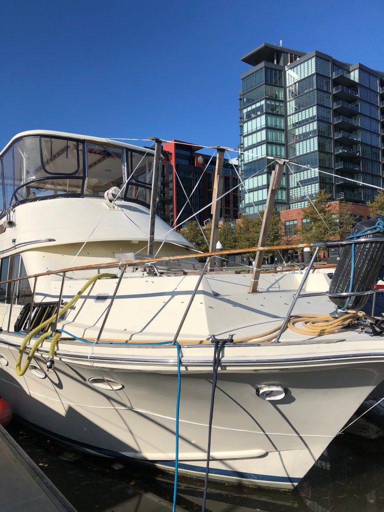 Actual departure was 12:30 pm as we had the lines cast off, and slowly backed the big girl out into the fairway between A and B docks. Once I got the clear indication from Charlotte that our bow was clear for turning, I began the process of turning the boat using the transmissions and the props to alter our direction turning us onto a heading out of the fairway and into the Washington Channel. You do not use the rudders inside the marina or in any confined areas, because the prop speed has to be a lot higher than safe for these tight areas, to make the rudders functional. So in these areas, the watchword is always, “go slow like a pro” and use only the props and transmission to move about. As we approached the end of the fairway, entering the Washington Channel (WC), we sounded our boat’s horn to inform any other boaters that the big girl was coming out to play.