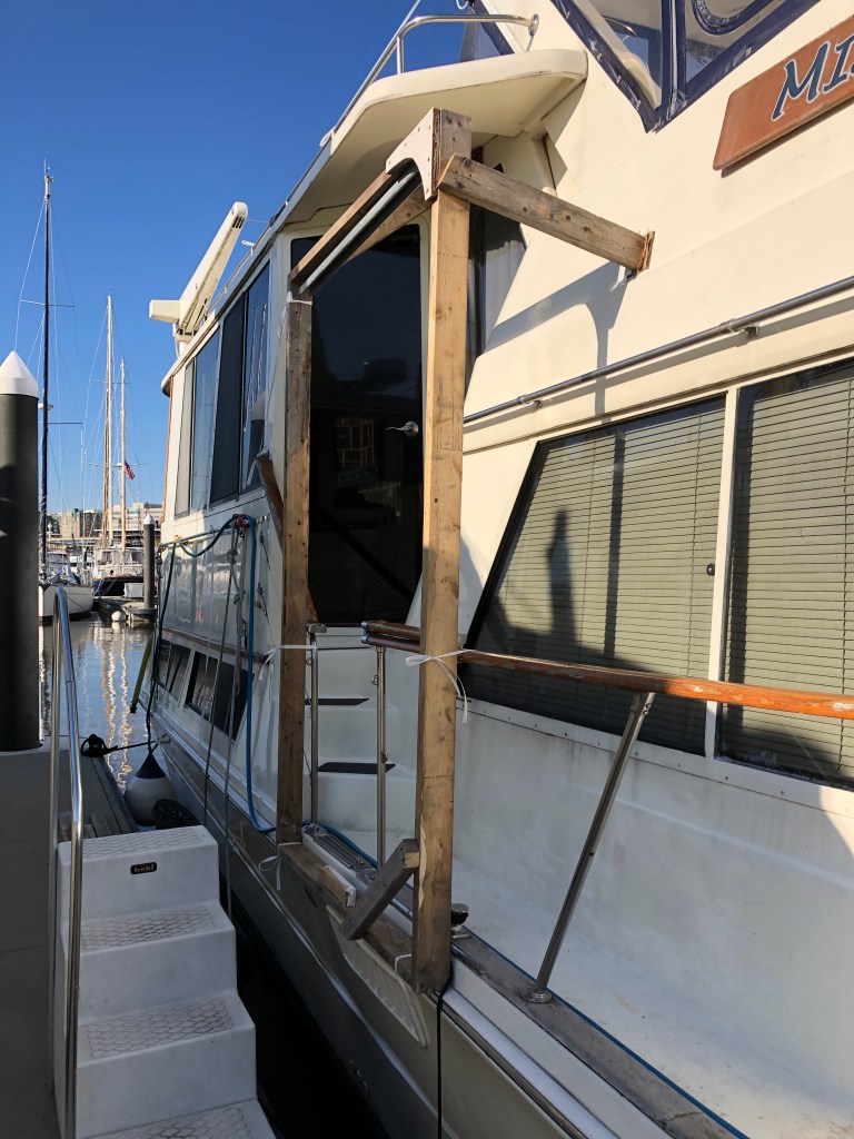 The door has been installed and it’s tracking mechanism corrected to allow our ability to enter and exit with the door sliding smoothly in both directions. The large window was installed as well, so we now have the ability to view the actions outside our boat and the additional docks behind us. This window will also allow sunlight to come through and warm the interior supplanting the electric heaters we have set up and use to ward off the Washington chill that sets in with great regularity (must be something with the hot air coming from the Capitol Building when Congress is in session, or from the White House for the same reasons).