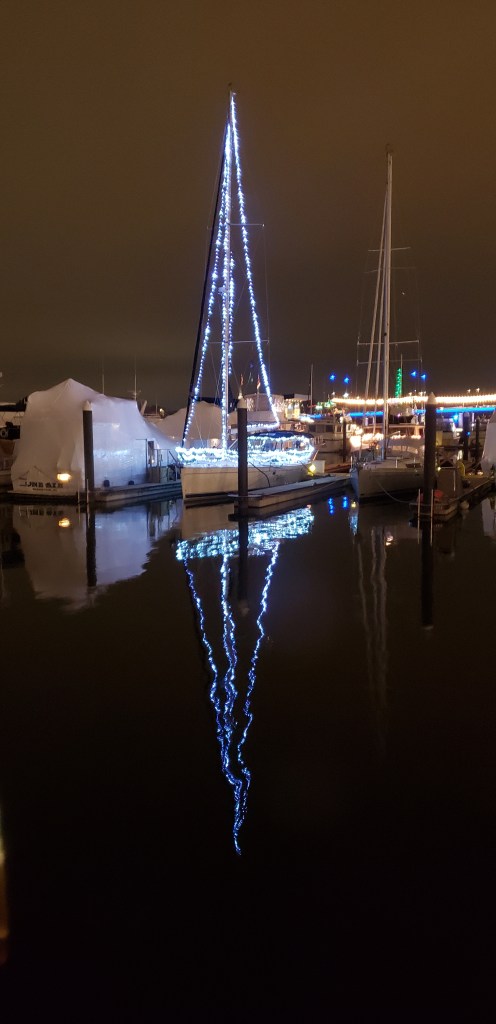 One last photograph, Charlotte just took this off our aft deck. It is a photo of one of our members (currently serving as Club’s Commodore), 49 foot sailboat lit up for the season. Tim is a retired Lt. Commander in the US Navy and currently works for a major government contractor company. The waters in the Channel are so still tonight they made a perfect reflection of Tim’s yacht.