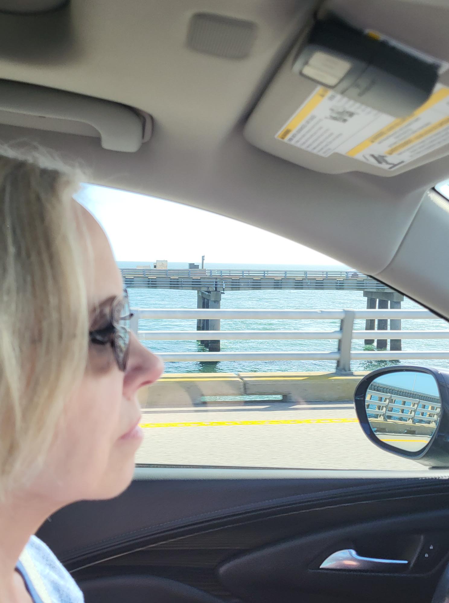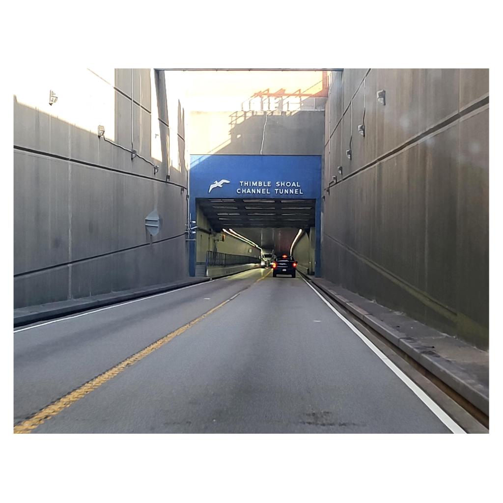The photos above were taken as we headed home from our day trip to Cape Charles. The Picture in the upper right is taken of the twin bridges as they curved around to point toward the Virginia Beach area. The upper center photo is of my wife with a view of the Atlantic Ocean beyond her window. The shot in the upper right is a photo of the Virginia Beach coastline. We were still a bit too far out for it to be very clear. And the photo in the lower left is a shot of the cranes working on prep work for a second tunnel which will expand the traffic flow to single direction in each tunnel. Right now, the single existing tunnel had single lane traffic in both directions. Finally, the picture in the lower right is a shot of our ascent from the second tunnel and our final leg over the Chesapeake Bay Bridge Tunnel and onward to the “peninsula” which is what the locals refer to our home area.