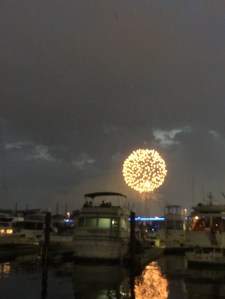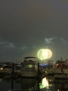 One nice advantage we enjoy with the Misty Lady home-berthed at the Capital Yacht Club on the DC Wharf waterfront is that on the Fourth of July, we do not have to fight traffic or crowds to see the 4th Fireworks Show from the Washington Mall. The pictures below are from the July 4 celebration. The photo of Charlotte sitting on our fore deck was taken about a half hour before the sun went down and the show started. The other pictures are shots of the fireworks display. This has been our ring side seat for both the 2017 show and this year 2018 display show. Grabbing a nice adult beverage, going to the fore deck and taking seats to await the start of the fireworks. Sadly the sea cats do not find this fireworks show amusing.